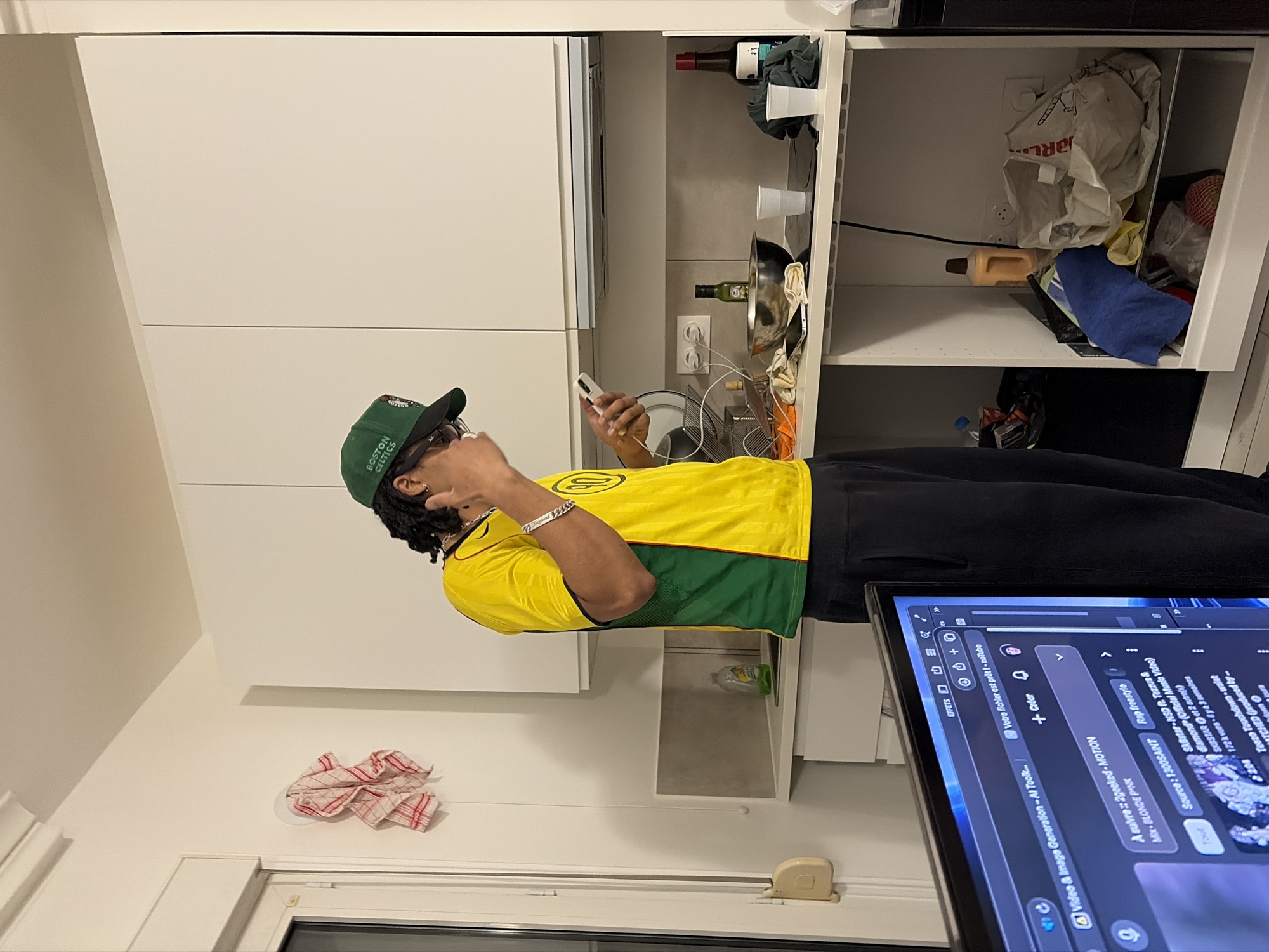 Here is a forensic description of the image: **Setting:** A kitchen in a residential apartment, potentially in Paris, France. **People:** A Black man, wearing a yellow and green sports jersey, black pants, a Boston Celtics baseball cap, and jewelry (bracelet and necklace), is present. He is holding a smartphone in his left hand and looking at it. **Objects:** * Kitchen cabinets (white) * A computer monitor displaying a video editing or creation application, is in the foreground. * Kitchen utensils and food items are visible inside the open cabinet above the countertop, including bottles (one labeled as wine), cups, bowls, and some food packaging. * A checkered dish towel is hanging on the wall near a window, along with what appears to be a retractable tape measure. * A European-style double electrical outlet is on the backsplash. **Actions:** The man is using his smartphone, likely browsing or interacting with content. **Environment:** The kitchen appears well-lit with a modern aesthetic, with white cabinetry.