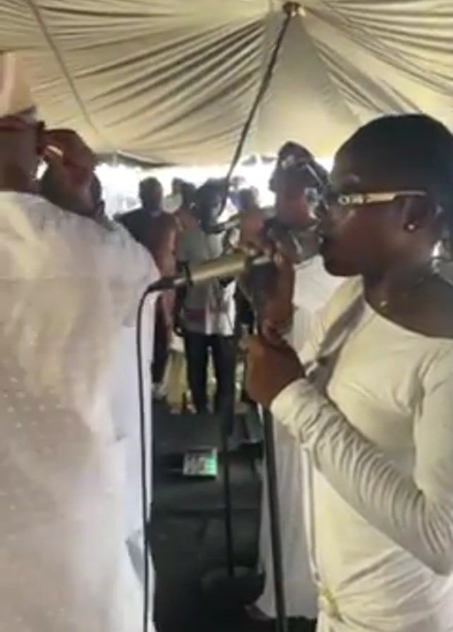 Under a large white tent, a woman in a white off-the-shoulder dress and gold-rimmed glasses sings into a microphone, surrounded by other people