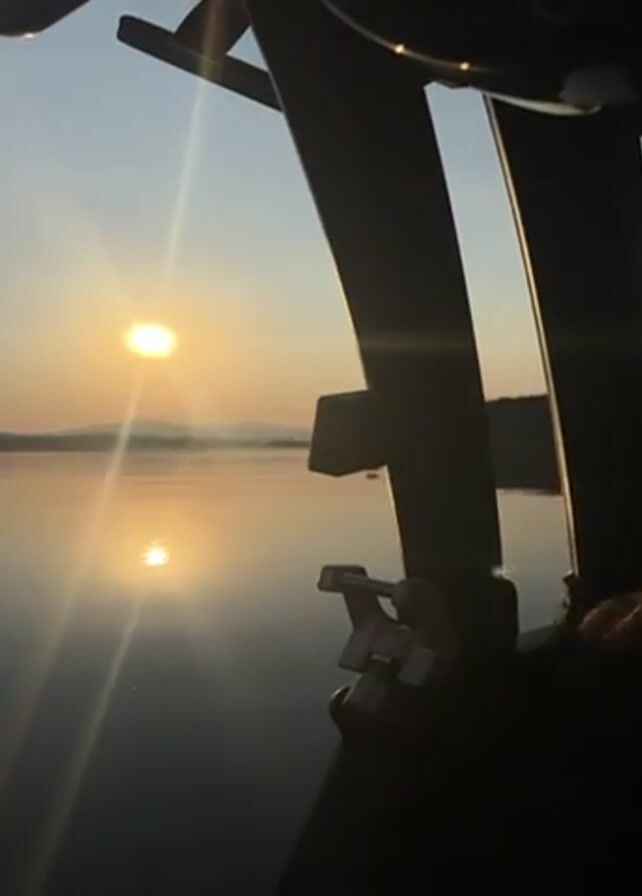 view from what appears to be a boat, with parts of the boat's structure visible in the foreground. A body of water reflects the light of the sun, which is low in the sky, possibly during sunrise or sunset. Distant land is visible across the water.