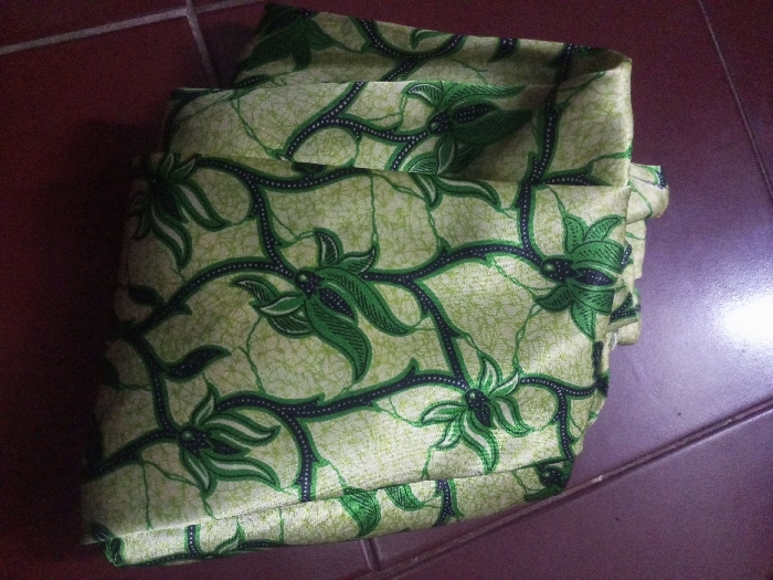 In the city of Bamhori, India, a piece of fabric is observed folded multiple times on a reddish-brown tiled floor. The fabric features a light green background with a repeating pattern of stylized dark green leaves and flower buds, outlined by dark blue lines and dots, interconnected by dark blue vines. The tiled surface exhibits visible grout lines. No individuals, actions, or interactions are present in the scene.