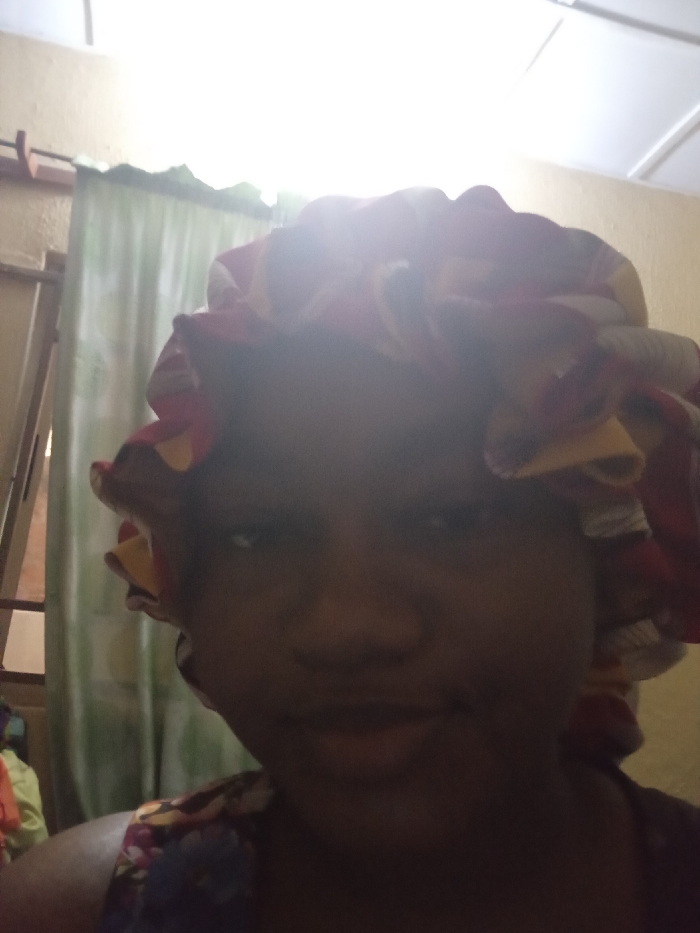 A person with dark skin, wearing a multicolored bonnet, poses for a selfie. The bonnet features red and yellow tones, with gathered edges. The individual has dark eyes and a neutral expression. A curtain is slightly visible in the background, positioned behind a window frame. A ceiling light fixture appears in the upper part of the image.