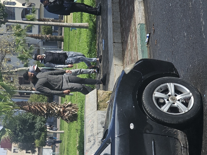 The image displays an urban outdoor scene in Salé, Morocco, featuring a street, a public green space, and several individuals under daylight conditions. In the foreground, the front passenger side of a black car is visible on an asphalt street. The car exhibits a silver five-spoke wheel rim, a black tire, a headlight, and a fender with visible scuffs and dirt. On the asphalt, adjacent to a green-painted curb, a blue and white cylindrical can lies on its side, accompanied by small brown debris. A concrete barrier or low wall is situated behind the car, bordering a grassy area. Three adult males are walking from the right to the left side of the frame, moving along a paved surface at the edge of the green space. The man in the lead, closest to the camera, wears a dark gray long-sleeved quarter-zip top, dark gray pants, and dark footwear. He has dark hair and a beard. Slightly behind him is a man wearing a light gray hooded sweatshirt (hood up, possibly over a cap), light gray sweatpants, and dark footwear. The third man, positioned further right, wears a black puffer vest over a lighter long-sleeved shirt, light-colored pants, and black slides. The mid-ground features a maintained green lawn with several palm trees characterized by prominent, textured trunks, interspersed with other leafy trees. Further in the background, another male figure in dark attire, carrying a dark shoulder bag, walks on a sidewalk. Multi-story buildings, consistent with residential or commercial structures, are visible behind the green space, featuring windows and balconies. Additional indistinct human figures are present further within the green space in the distant background. The sky is clear, and shadows are cast from the trees and individuals, indicating a sunny day.