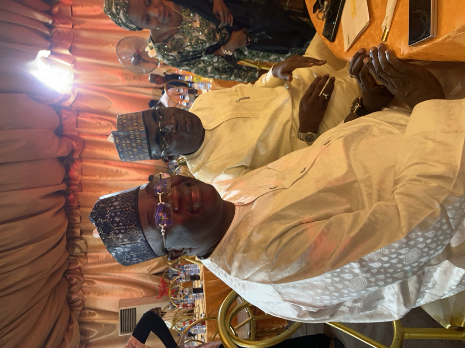 Two men in white traditional attire and patterned caps sit beside each other at a table. The man in the foreground smiles, sporting eyeglasses with colorful frames. The other man wears glasses and has his hands resting in his lap. A woman in a patterned headscarf and dress is visible in the upper right. Water bottles are on the table, and a fan is in the background. The setting appears to be indoors, with golden draping and ornate furniture.