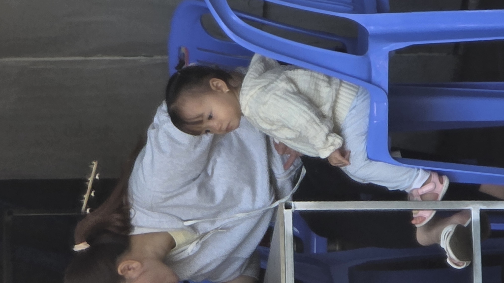 A child wearing a white cable-knit sweater and light blue pants is positioned within the frame of a blue plastic chair in Unknown, Vietnam. The child is partially obscured by the chair's structure. An adult with dark hair pulled back into a bun is holding the child. The adult is wearing a light-colored shirt. The environment appears to be indoors, based on the lighting and surroundings. The background is blurred.