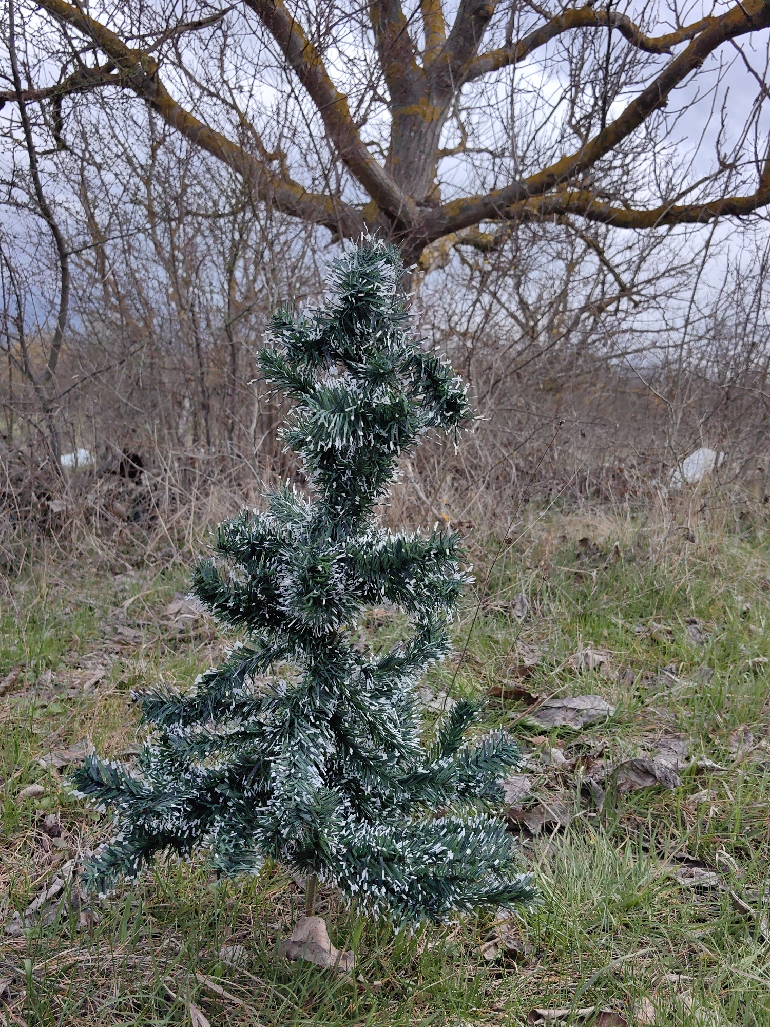 An artificial Christmas tree is positioned upright in a natural, uncultivated outdoor environment in Makariopolsko, Bulgaria. The small tree, dark green with white frosted tips on its branches, stands slightly to the left of the frame's center. Its base is anchored by a visible brown stand, partially obscured by a small, light-brown object, possibly a rock or wood. The ground beneath the tree is covered with a mix of green grass and scattered dry brown leaves and grass blades. In the background, a dense growth of leafless deciduous trees and brush dominates the scene. The larger, bare tree trunks and branches in the mid-ground exhibit a yellowish-brown coloration. The sky overhead is overcast, appearing light grey. No individuals are present in the image. Scattered within the background vegetation are indistinct brown and darker shapes, and one distant, irregular white object, possibly debris.