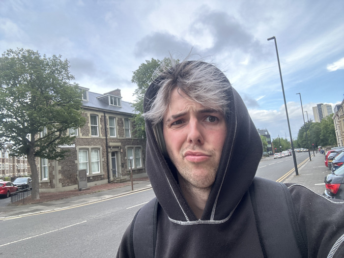 A young man in a black hooded sweatshirt stands on a street. He has gray-streaked hair and a slightly displeased expression. A brick building with white-framed windows and a gray roof stands behind him to the left. Trees line the street on both sides. Cars are parked along the right side of the street. A tall lamppost is visible in the background on the right. The sky is overcast with gray and white clouds.