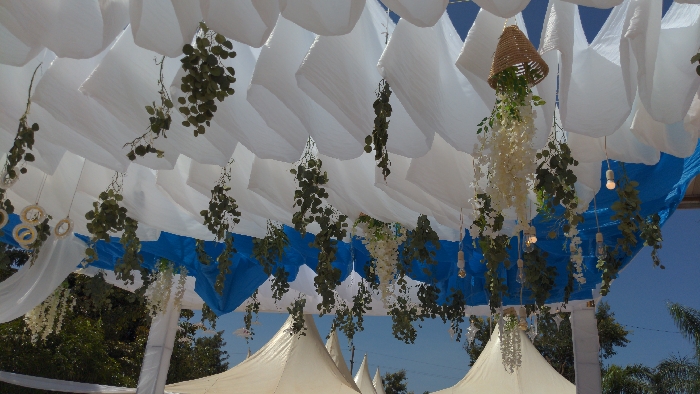 The scene depicts an outdoor event decoration structure in Soweto, Tanzania. Overhead, a canopy is formed by numerous undulating white fabric drapes, interspersed with sections of blue fabric visible behind them. Suspended from this canopy are various decorative elements: multiple strands of artificial green leafy foliage, white artificial floral garlands, and numerous bare filament light bulbs, several of which are illuminated. On the left side, multiple decorative light-colored rings are strung together and hang down. Towards the upper right, a woven light brown basket-like ornament is suspended, from which green and white artificial flora protrudes. A clear blue sky is visible through gaps in the canopy structure. In the background, the pointed peaks of several white event tents are discernible, along with scattered green trees and vegetation. No individuals are present in the frame. The scene is brightly illuminated by natural daylight.