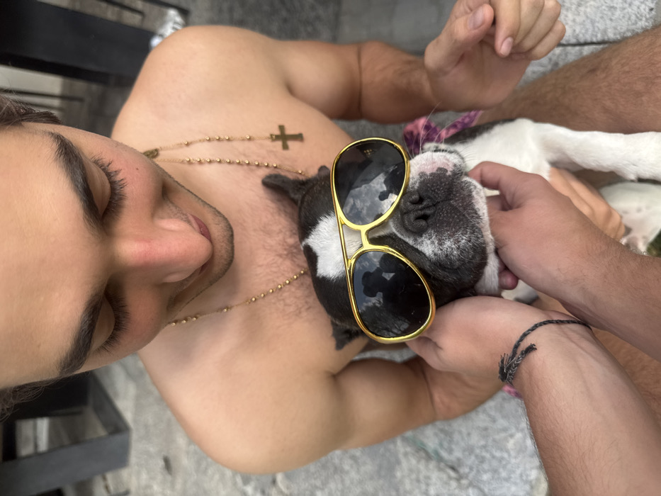 A shirtless man with a gold chain and cross rests back, eyes closed. A small, white and dark gray bulldog lays on his chest, wearing gold-framed sunglasses. The dog's head is held by two hands; one hand has a frayed bracelet. The scene is shot from above.