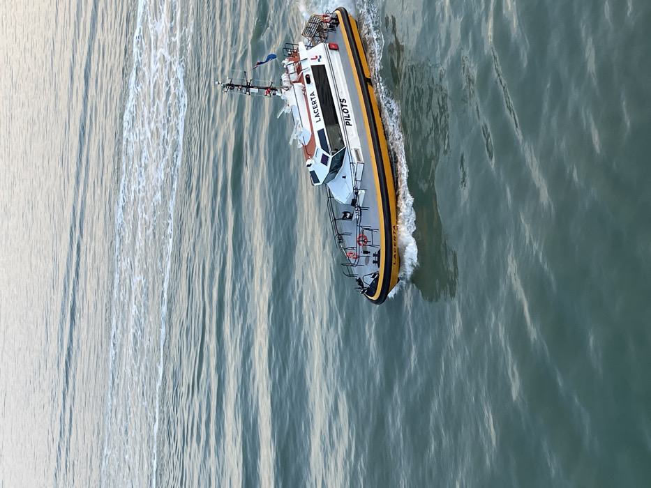 A pilot boat, identified as "LACERTA" and bearing the text "PILOTS" on its side, traverses the waters near Vlissingen, Netherlands