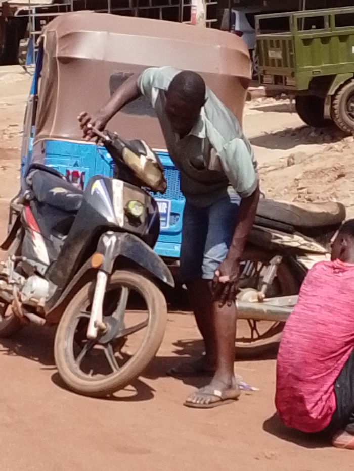 The image depicts an outdoor scene in Tamale, Ghana, on an unpaved reddish-brown dirt surface under bright daylight. A dark-skinned male, wearing a light green short-sleeved collared shirt, blue shorts, and light-colored flip-flops, stands bending forward in the center. His right hand is on the handlebars of a black and silver scooter-style motorcycle, while his left hand rests on his left knee. The motorcycle is parked on the dirt. Behind the motorcycle and the man is a blue tricycle with a brown canopy. To the far right, partially visible from the back, another individual in a red horizontally striped shirt crouches low to the ground. In the distant background, a green open-bed vehicle or trailer is partially discernible.