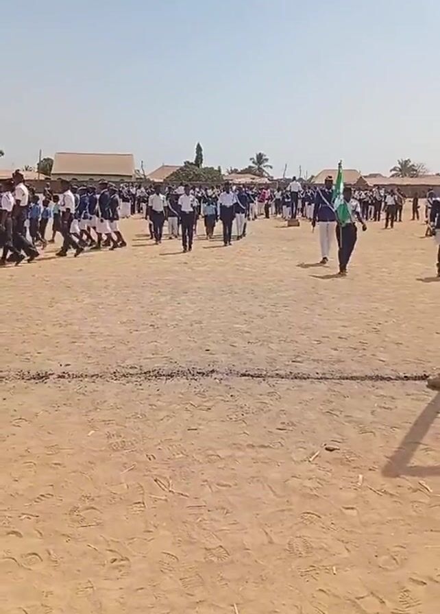 large group of people on a dirt field, seemingly at a parade or ceremony. Most individuals are wearing uniforms, with some in dark blue and white and others in white shirts and dark pants. A marching band can be heard playing in the background. There is a soccer goalpost on the right side of the frame, and several buildings are visible in the background. The day is sunny with a clear blue sky.