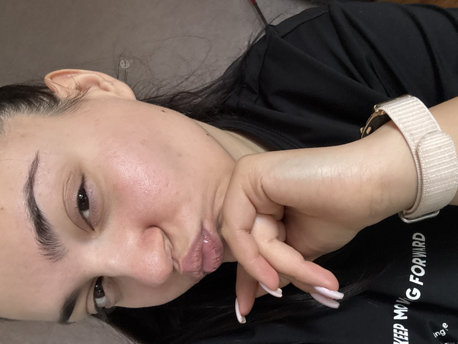 The image displays a close-up, slightly high-angle view of a single individual, appearing to be an adult female, positioned indoors. The subject has medium skin tone, dark hair pulled back, and dark eyes. Her eyebrows are dark and shaped. Her lips are pursed, forming a "kissing" or "duck face" expression, with a visible sheen. Her right hand is raised, with fingers curled beneath her chin. The fingernails are elongated and have a light-colored polish. She is wearing a black short-sleeved shirt with partially visible white text that reads "KEEP MOVING FORWARD". On her right wrist, a gold-toned watch face is secured by a light pink or beige fabric wristband with a hook-and-loop closure. The background is a plain, indistinct light brown or beige surface, consistent with an interior wall. No identifiable landmarks or features within the image indicate a specific location in Sofia, Bulgaria, or any other city.