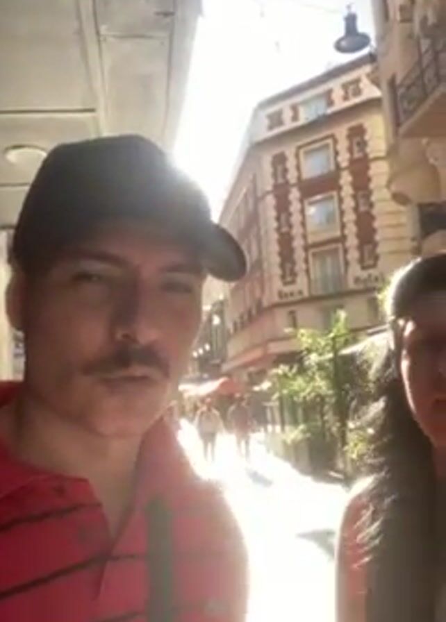 A man wearing a red and black striped shirt and a black baseball cap is filming a video of himself and a woman. He is looking at the camera with a smile on his face. The woman is standing next to him, and she is also looking at the camera. They are standing on a street in Buenos Aires, Argentina. There are buildings on both sides of the street. There are people walking around in the background. The sun is shining brightly.