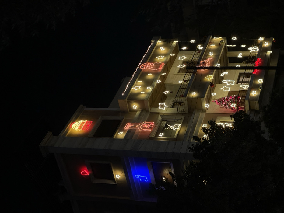 A low-angle nighttime shot reveals a multi-story building adorned with Christmas lights. Illuminated stars are scattered across the facade, interspersed with neon figures of Santa Claus, a Christmas tree, and other holiday-themed shapes in red, orange, and blue. A fire escape ladder is visible on one side. Dark trees obscure the lower portion of the building, emphasizing the brightness of the decorations against the night sky.