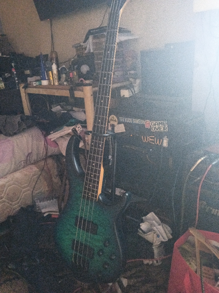 An indoor scene in Dogsenang Gorphoog, Bhutan, depicts a cluttered room with a focus on musical equipment. In the foreground, a four-string electric bass guitar, featuring a teal-to-dark green burst finish on its body, black pickups, and control knobs, stands upright on a black guitar stand. Its light-colored fretboard has dot inlays, and the headstock is dark. To the immediate right and behind the bass guitar is a large, dark amplifier or speaker cabinet. This cabinet bears three white stickers: one with the text "TEU KUDU RIWEUH," another displaying "GAME OVER" with a pink pig character, and a third with "WEW" and a stylized drink cup icon. A crumpled white tissue or cloth is visible on top of the cabinet. Red and black cables are partially discernible on the floor near the amplifier's base. Further to the right, a red fabric bag or container, partially obscured, contains some items. To the left and behind the bass, a light-colored wooden table is visible, cluttered with various bottles, a dark circular object, and other indistinct items. The area beneath the table is also cluttered with fabrics and miscellaneous objects. Adjacent to the table on the far left, a mattress or bedding with a pink and white pattern is partially visible, draped with dark fabric. A spiral-bound notebook and additional small items rest near the base of the bedding. The room has light-colored walls. A strong light source from the upper right creates significant glare, particularly over the right side of the image and the amplifier, obscuring some details. The overall impression is that of a lived-in, unorganized interior space. No individuals are present in the image.