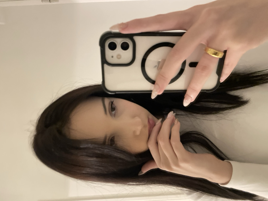 A female is depicted in a chest-up mirror selfie within an indoor setting. She has long, dark brown hair, parted, with strands framing her face, and wears a plain white long-sleeved top. Her left hand rests near her chin, fingers slightly curled, while her right hand holds an iPhone. The phone is visible in a clear case with a black bumper and a distinct black MagSafe ring on the back, and its dual camera system is identifiable. A golden-colored ring is worn on the ring finger of her right hand. Both hands feature long, almond-shaped fingernails with light-colored polish. The background is an indistinct light-colored interior wall or door. There is no discernible information within the image to determine a specific location within Cachan, France.
