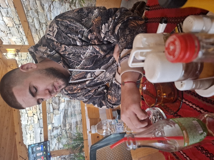 An adult male with a short, faded haircut and light facial stubble is seated at a wooden table in an establishment located in Strazhitsa, Bulgaria