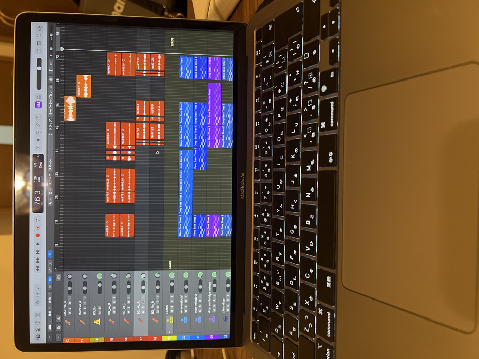 A silver/space gray MacBook Air laptop is open and powered on, positioned on a dark, unidentifiable surface within an indoor setting in Ichikawa, Japan. The laptop's screen displays a Digital Audio Workstation (DAW) interface, likely for music production. The interface shows a track list on the left with multiple audio and MIDI tracks, labeled "MAIN Vo.3," "BG_Vo," "LEADS," "verse melody 1," and "piano drop." The main arrangement window features various colored regions: orange/red waveforms on vocal tracks (e.g., "rec#79.1," "rec#82.1"), and blue and purple MIDI blocks on instrumental tracks (e.g., "Deep Bass Tines E," "Electric Piano"). A transport bar at the top indicates a tempo of 120 BPM, a 4/4 time signature, and a current position of "76 3." The laptop's keyboard is backlit, displaying a Japanese character layout alongside standard alphanumeric keys. A large, integrated trackpad is visible below the keyboard. Reflections of an overhead light source are discernible on the laptop screen. No individuals are present in the image.