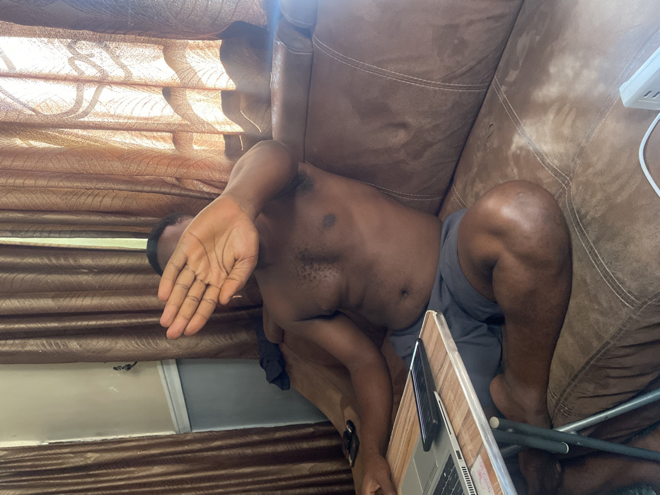 The scene depicts an adult male seated on a brown, upholstered couch in an indoor setting, identified as the city of Markurdi, Nigeria
