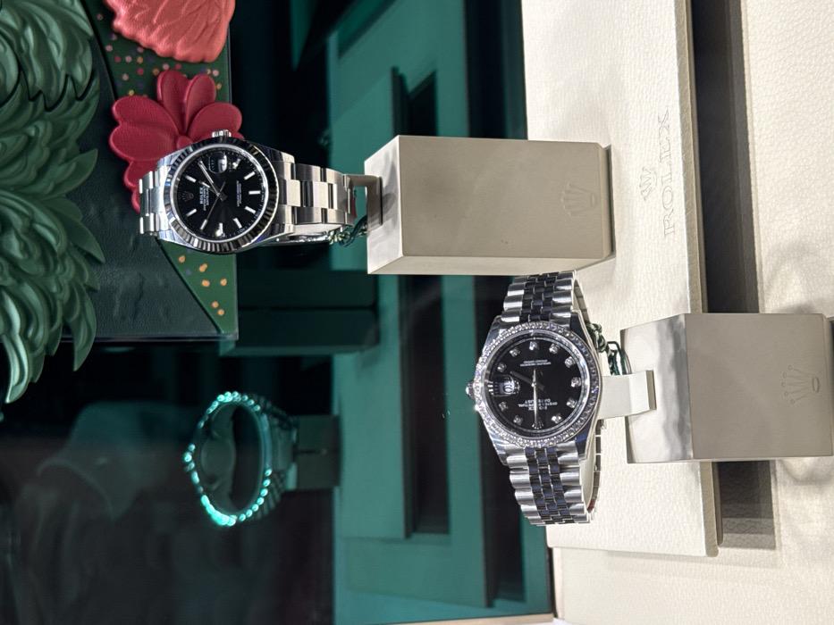 Two Rolex watches are displayed. The top watch is stainless steel with a black dial and fluted bezel, resting on a branded display block near a floral decoration. Below, another stainless steel Rolex with a diamond-set bezel and jubilee bracelet sits on its own branded display. The watches reflect on a glass surface, adding to the display's visual depth. The Rolex logo is visible on the display blocks.