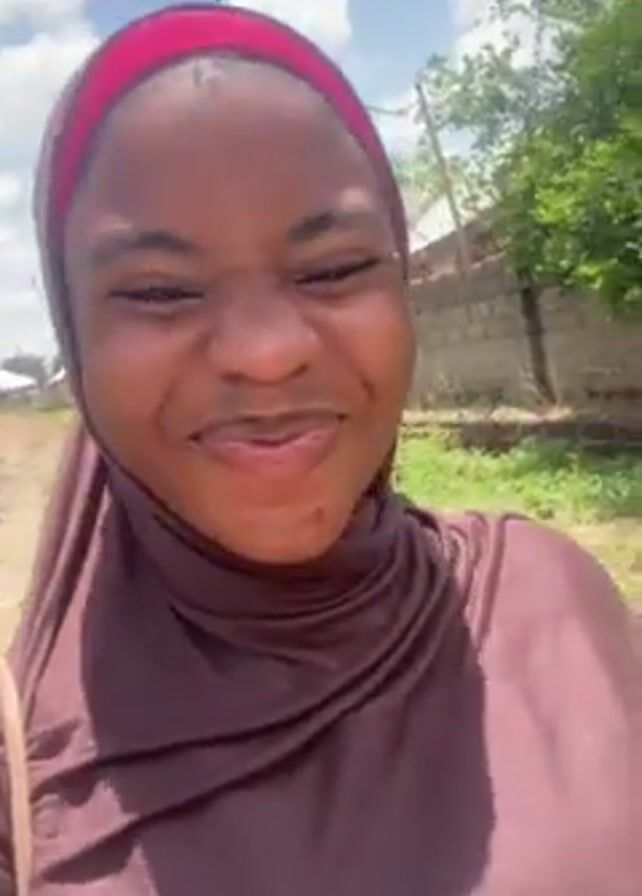 young woman with brown skin and wearing a brown hijab with a pink headband. She smiles, shows her teeth, and makes a kissing face at the camera. She is outdoors on a sunny day, with a dirt road and greenery behind her. There is a building visible in the background as well as power lines overhead. She appears to be walking or standing still while holding the camera in front of her.