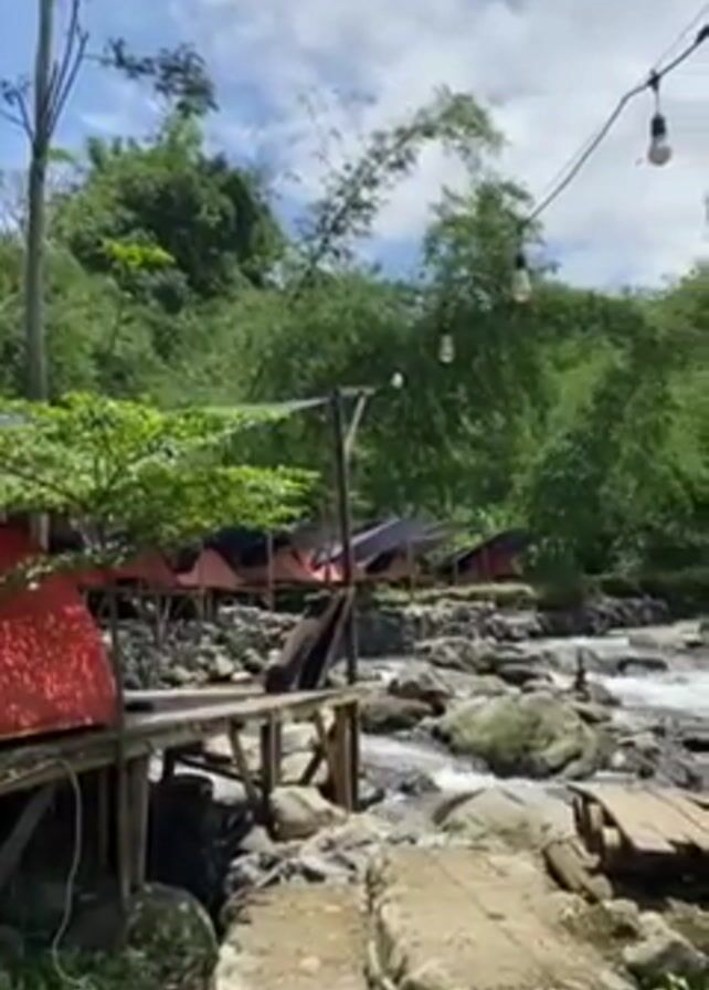 The camera pans left to right to reveal a forested riverside campsite on a sunny day with a few clouds in the sky. The camera is focused on a rocky river with a wooden bridge crossing it. The rocky banks of the river are lined with green vegetation, including tall bamboo stalks. On the left river bank, there are several tented structures that appear to be elevated slightly off the ground on wooden platforms. String lights hang overhead. The water is flowing rapidly over the rocks.