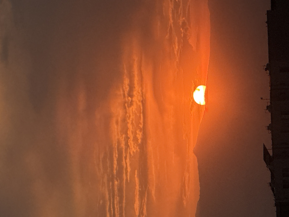 The image displays a wide shot of a sunset or sunrise over San Francisco Ocotlán, Mexico. The sky is dominated by shades of orange, transitioning from a darker, reddish-brown at the top to a brilliant, fiery orange and yellow near the horizon. Stratus clouds are visible, arranged in horizontal streaks and smaller formations, especially in the mid-ground. The lower half of the sky is filled with the bright, intense orange glow emanating from the sun. The sun itself, a radiant yellow-white orb, is partially obscured by the silhouette of a mountain range that stretches across the middle of the frame. The mountain peaks are dark and indistinct against the bright sky, with a prominent peak visible on the left side. In the immediate foreground, the dark silhouettes of urban structures, consistent with rooftops, are visible across the bottom of the image. Indistinct objects are present on these rooftops, including what appears to be an angled solar panel or similar structure on the left and several smaller, rounded or cylindrical objects on the right. No people or overt actions are depicted.