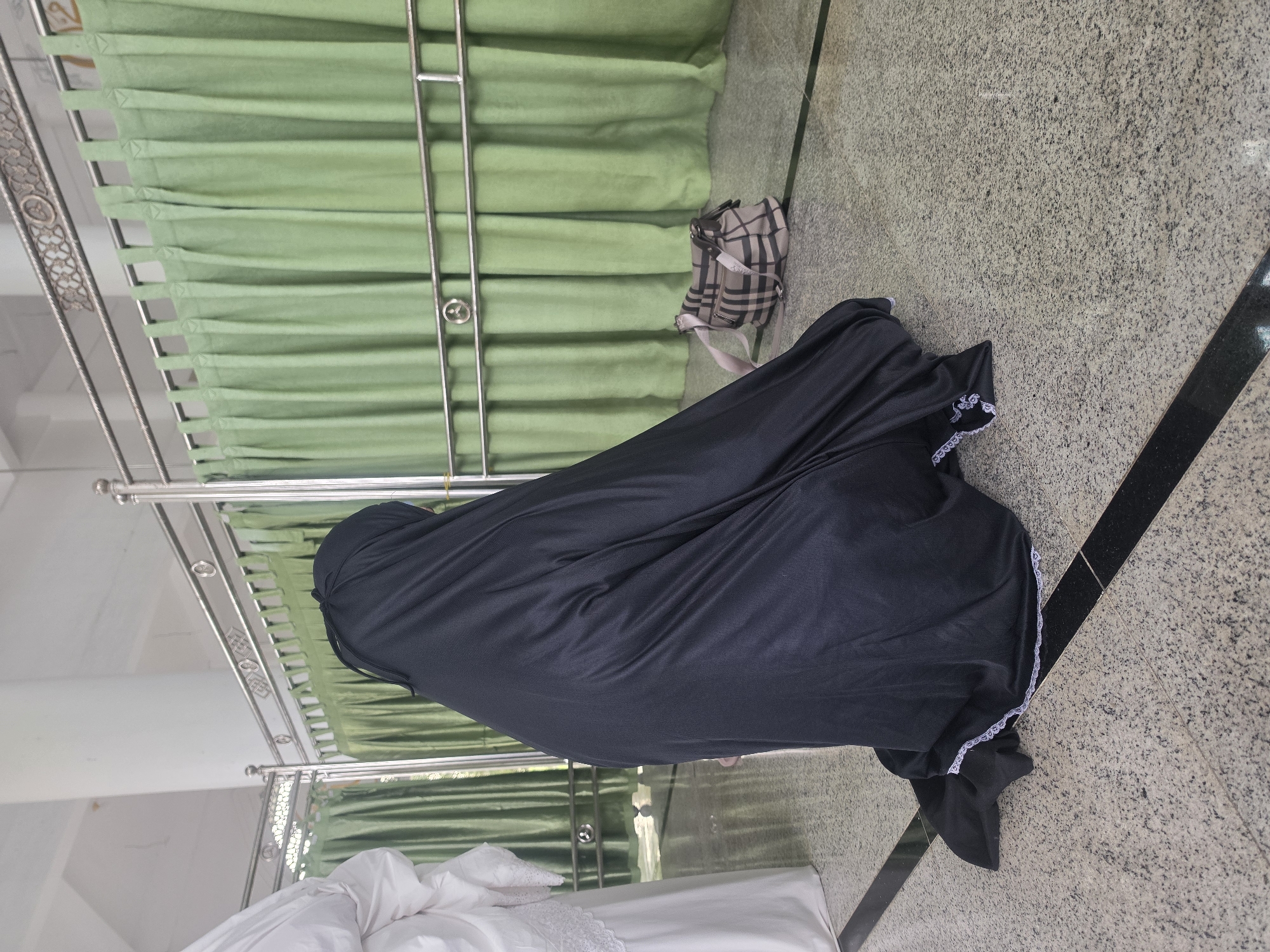 An interior view in Blangmetimu, Indonesia, depicts two individuals within a prayer or segregated area. In the foreground, a person fully clad in a black prayer garment with white lace trim along the hem kneels facing away from the viewer, their head covered by a black hijab or khimar. To the immediate left, a portion of another individual, dressed in white, is visible, suggesting a standing posture. A beige and brown plaid-patterned shoulder bag with a light strap rests on the light grey speckled tile floor to the right of the kneeling figure. The background features a metal railing system, possibly stainless steel, from which light green pleated curtains are suspended, forming a partition. A black tile strip runs horizontally across the floor in the lower section of the frame. White walls and a white column are visible above the partition in the background.