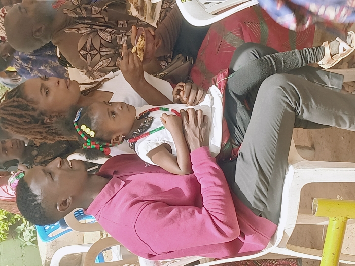 An outdoor scene in the city of Masvingo, Zimbabwe, depicts a group of individuals seated. In the foreground, an adult male with dark skin and a short haircut, wearing a dark pink polo shirt and dark grey trousers, sits on a white plastic chair. He holds a young dark-skinned female child, approximately three to five years old, on his lap. The child wears a white sleeveless top, dark leggings, light-colored sandals, and has dark hair adorned with red, green, and yellow beads in multiple braids. She also wears a multi-colored beaded necklace. The man and child are both looking towards the right side of the frame. Directly behind the child, an adult female with dark skin and reddish-brown dreadlocks, wearing a white v-neck top and a red and dark-patterned skirt, is visible. She holds a small, dark-colored bowl in her left hand and a spoon in her right hand, appearing to be eating. She is also looking towards the right. Several other individuals are partially visible and out of focus in the background, seated on white plastic chairs. The ground consists of light brown earth. A yellow metal object is partially visible in the lower-left foreground.