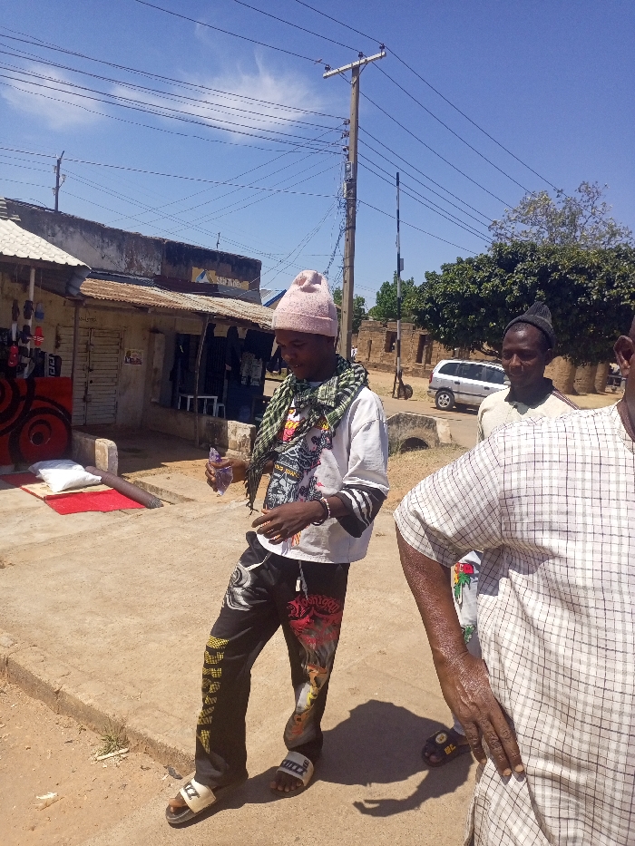 The image depicts a daytime street scene in Jos, Nigeria, under a clear blue sky with sparse clouds. In the foreground, three adult males are present. The central figure, a young male, wears a light pink knit beanie, a white long-sleeved graphic t-shirt, a checkered green and white scarf, black graphic pants featuring skulls and text, and white slide sandals. He holds a crumpled clear plastic item in his left hand and gestures with his right. To his right, another male in a dark beanie and light-colored top stands, partially obscured, looking towards the central figure. On the far right, the chest and left arm of a third male are visible, wearing a plaid short-sleeved shirt with his hand on his hip. The setting includes a paved foreground transitioning to unpaved dirt ground. To the left, a row of single-story commercial structures with corrugated metal roofs and whitewashed walls line what appears to be a street. Merchandise, including footwear and clothing, hangs outside one shop. A red mat and a white cushion are placed outside a shop entrance. In the mid-ground, a light-colored sedan is visible on a dirt road, behind which are more rustic buildings, some appearing partially dilapidated. A prominent wooden utility pole with numerous overhead power lines stands centrally. A black and white striped barrier, consistent with a railroad crossing arm, is present in the mid-background. Green trees are visible in the background on the right.