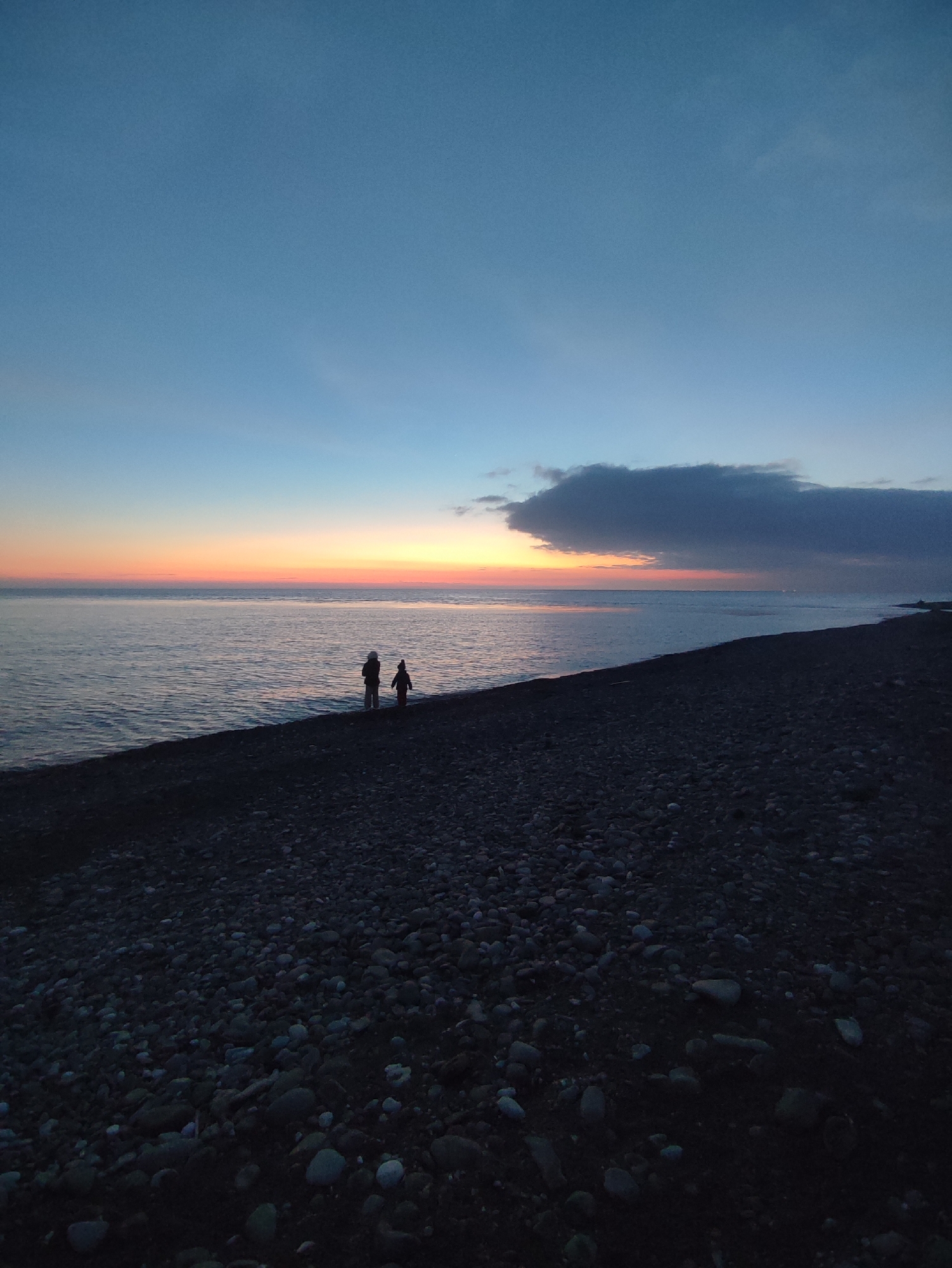 The image depicts a twilight scene on a pebble beach in Sirius, Russia. Two figures stand near the water's edge. A body of water, presumably the Black Sea, stretches to the horizon where a colorful sunset is visible. Above the sunset, the sky transitions from orange to blue. A dark cloud is visible near the horizon. The foreground is dominated by dark, rocky pebbles. The lighting is low, suggesting the time is near dusk.