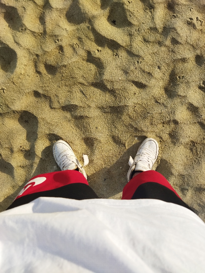 A first-person perspective photograph shows a person standing on sand. The sand is textured with shadows and small disturbances. The person wears white sneakers with untied laces, shorts with red, black, and white panels, and a white t-shirt. The viewpoint is looking down, focusing on the ground and lower portion of the individual's clothing.