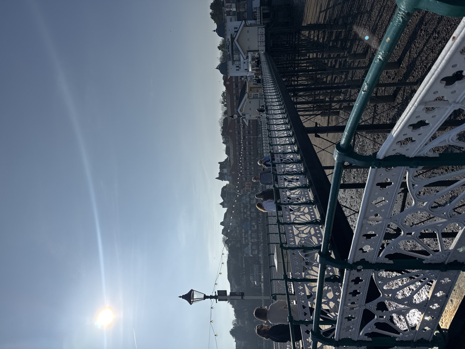 The image captures Penarth Pier in Penarth, United Kingdom, on a clear, sunny day. The sun is positioned in the upper left, producing lens flare and a horizontal light streak across the blue sky; a faint contrail is visible. The pier's structure dominates the lower and mid-sections of the frame, featuring dark green structural elements and white, ornate cast-iron railings with a dark green top rail. The ground beneath the pier is a dry, rocky beach or seabed, indicating low tide, with visible shadows cast by the pier's support piles. Approximately nine individuals are present on the pier. In the foreground-left, two women walk away from the camera, one in a dark top, the other in a light beige top. Further along the pier, a group of five people are walking or standing, mostly facing away. Two additional individuals are visible further down the pier. A black, ornate street lamp post stands on the left side of the pier. A string of decorative lights is strung below the lamp post and extends further along the pier. In the mid-ground, along the pier's length, several small white buildings with pitched roofs are visible, leading to a larger white building with a distinctive domed roof at the pier's far end. The background displays a coastal town built on a hillside, featuring numerous multi-story buildings with varied architectural styles and rooflines, some with darker facades. Additional string lights are visible stretching along the waterfront in the background, connecting to the town structures.