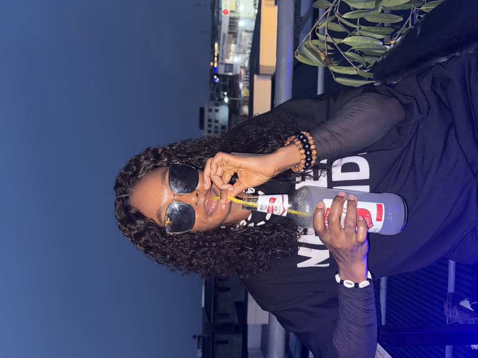 A woman with curly hair and sunglasses drinks from a Smirnoff Ice bottle with a straw. She wears a black t-shirt with white text and long sleeves. Bracelets adorn her wrists. The background features a night sky, city buildings with lights, and some greenery. The image is rotated, displaying the scene on its side.