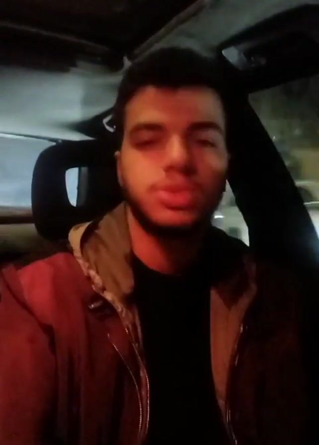 A man is sitting in the driver's seat of a car at night. He is wearing a dark shirt and a brown and red jacket. He has dark hair and a beard. The car's interior is dark, with a sunroof visible. The man is looking at the camera and gesturing with his hand while speaking. The background is blurry due to the darkness and likely the car being parked or slowly moving.