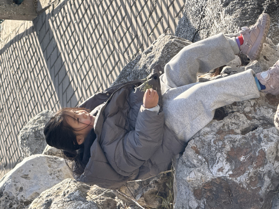 A young person in a gray puffer jacket and gray sweatpants reclines on large, gray rocks. They are wearing sneakers with a visible sock that has stripes of pink, blue, and purple. Their dark hair is partially covering their face. The person is holding a small piece of greenery in their hand. A gray fence is partially visible in the background, casting shadows on the nearby concrete.