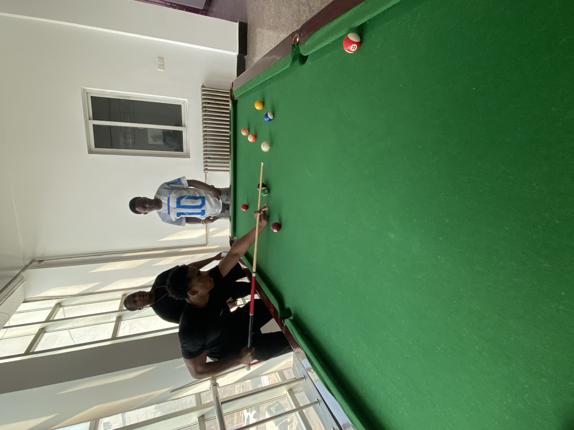 Two males are playing pool inside a building. One male, wearing a black shirt, is poised to strike a red ball on the pool table with a pool cue. Another male, wearing a jersey with the number "10" on it, watches. The pool table is green and has several colored pool balls on it. A window and a radiator are in the background. The location is possibly Zhongtun, China.