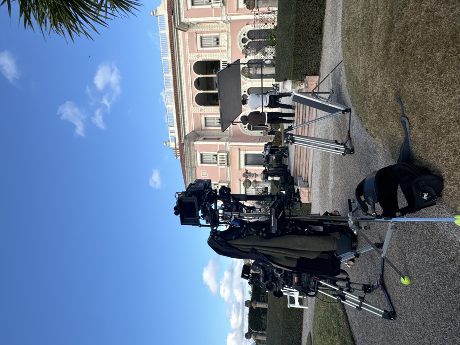 The image depicts an outdoor film production setup in the formal gardens of a grand, multi-story pink mansion with white architectural accents, situated in Unknown, Unknown
