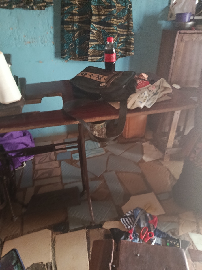 A cluttered sewing area reveals a vintage machine on a wooden table. Fabrics and a handbag share space with a Coca-Cola bottle. Below, a tiled floor with missing pieces adds to the room's worn ambiance. A purple cloth, scissors, and other sewing supplies scatter the scene. A cabinet sits to the right, adding to the chaotic yet functional setting.