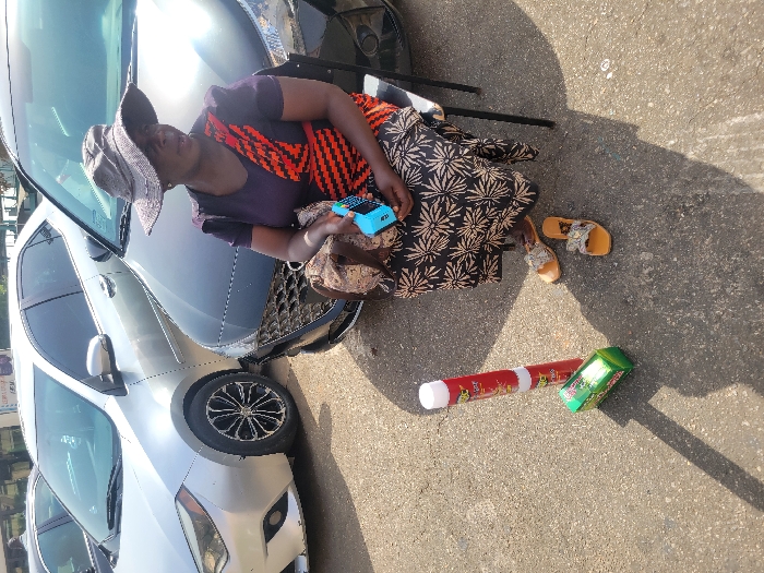 This image captures an outdoor scene in Abuja, Nigeria, under bright daylight conditions. An adult female is seated on a black metal folding chair on an asphalt pavement. She wears a wide-brimmed greyish-brown hat, a dark purple short-sleeved top, a red and black patterned sash, and a dark, patterned skirt or wrapper. Her footwear consists of tan, open-toed sandals. She holds a light blue feature phone in her right hand, and a brown patterned shoulder bag rests on her lap. To her left, on the pavement, two red aerosol cans labeled "MAGIC" are stacked vertically, with a green rectangular box featuring a plant motif positioned horizontally in front of them. Behind the woman is the front of a dark-colored sedan, possibly a Hyundai Accent, parked on the pavement. To the left of this vehicle, the front and side of a silver-colored sedan, consistent with a Toyota Corolla with aftermarket rims, are visible. Strong shadows are cast on the pavement, indicating direct sunlight.