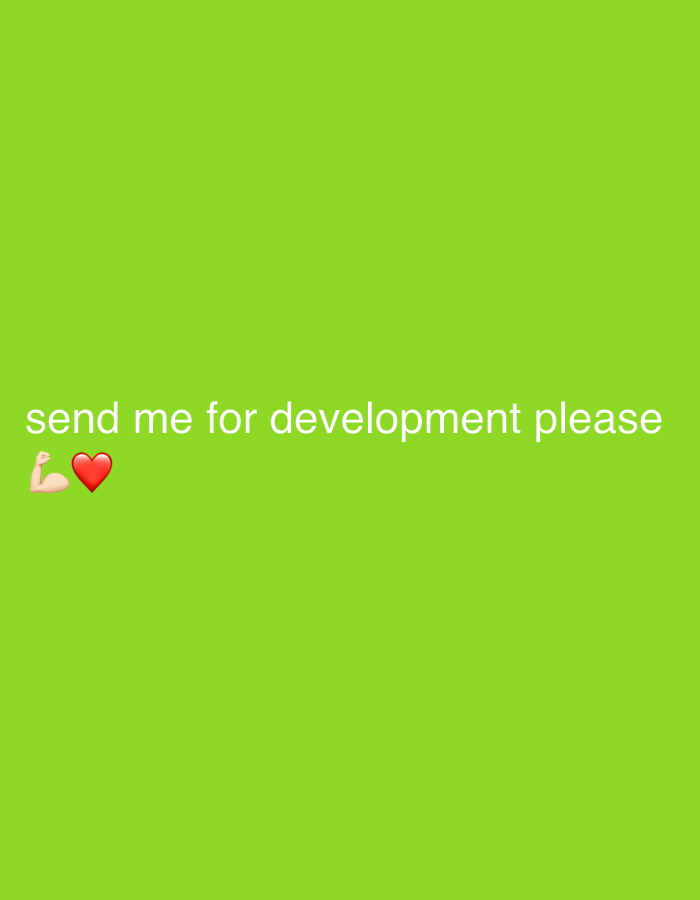 - "The image is a solid green background with the text "send me for development please 💪❤️"" by FM-jv6L12, licensed under CC BY 4.0