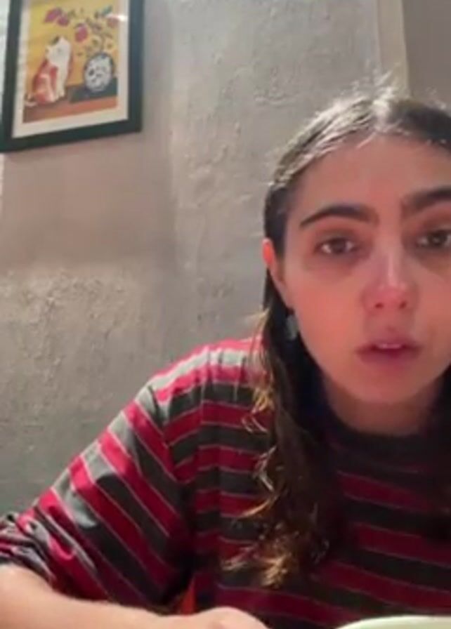 A young woman with wavy brown hair and a red-and-gray striped shirt takes a sip from a blue mug