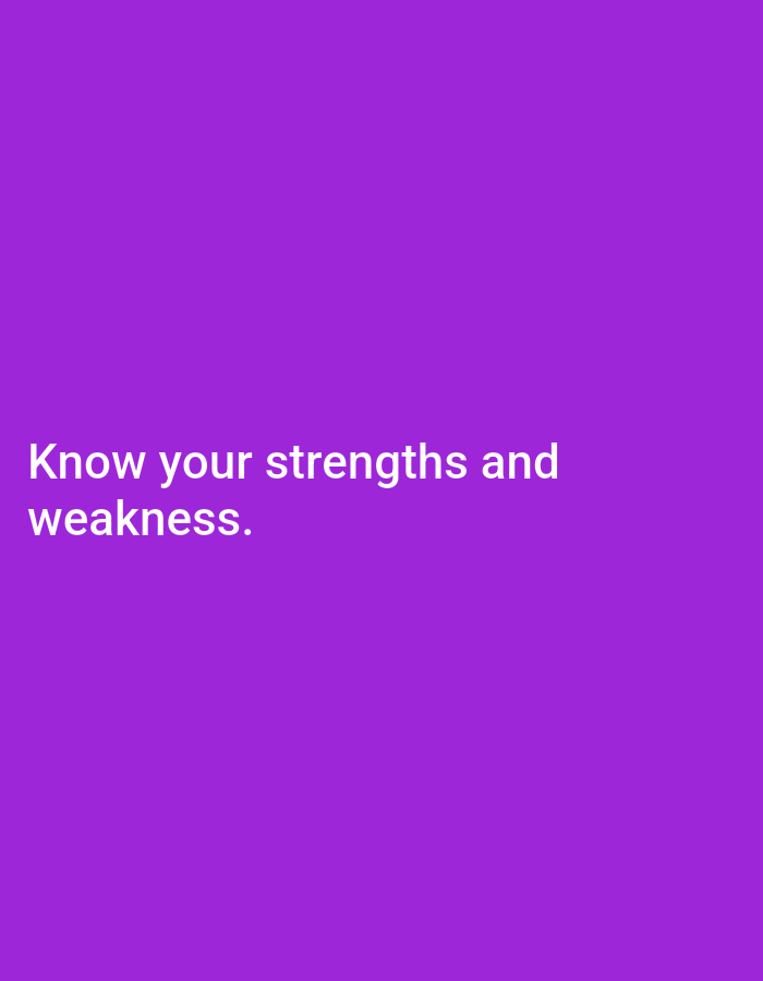 A solid purple background features the phrase "Know your strengths and weakness