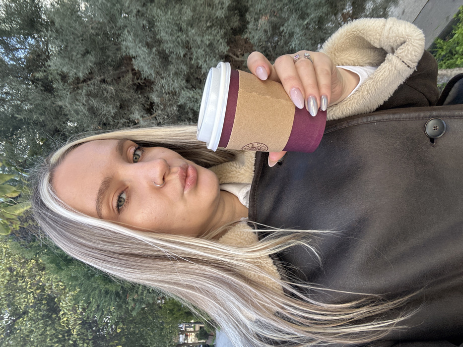 A female individual is depicted outdoors in a close-up, holding a beverage cup. She has long, blonde hair with prominent light-colored streaks and light-colored eyes. A small silver ring pierces her left nostril, and her lips are pursed. She wears a dark brown jacket featuring visible cream-colored sherpa lining on the collar and cuffs, over a white inner garment. Her left hand, adorned with light pink and metallic silver nail polish and two rings, grips a maroon-colored disposable cup with a brown heat sleeve and a white lid. A partial logo, consistent with "Mocaco Coffee," is visible on the sleeve. The background consists of natural green foliage, primarily dense evergreen trees or shrubs, illuminated by clear daylight. This scene is located in Başakşehir, Turkey.