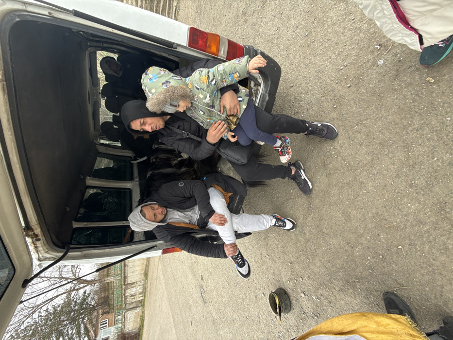 A white panel van with an open rear hatch is parked on an unpaved surface in Zidarovo, Bulgaria. Two adult males and a small child are seated on the edge of the van's rear threshold. The male on the left wears a grey hooded sweatshirt, a black puffer jacket, light grey sweatpants, and black and white sneakers, with his right leg crossed. The male on the right wears a dark hooded top, a black puffer jacket, dark pants, and black sneakers, with a dark shoulder bag. He holds a young child dressed in a multi-colored hooded winter jacket, dark blue pants, and colorful sneakers on his lap. Additional obscured figures are visible within the darkened interior of the van. On the ground to the left, a dark metal bucket or container is present. The background features a light-colored house with a fence and bare trees under an overcast sky. Partial views of two other individuals' clothing and footwear are visible in the immediate foreground, outside the van.