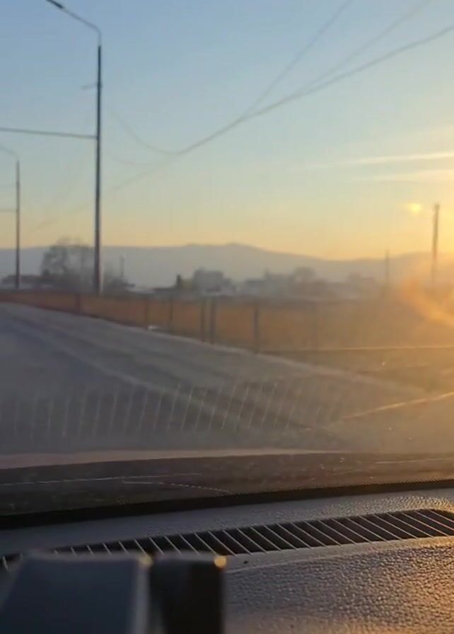 The video is taken from inside a car moving forward on a road. The camera is focused through the windshield, showing the road ahead and a bright sunrise in the distance. Streetlights and power lines line the road, and several other cars can be seen driving in the same direction. The sky is clear and blue.