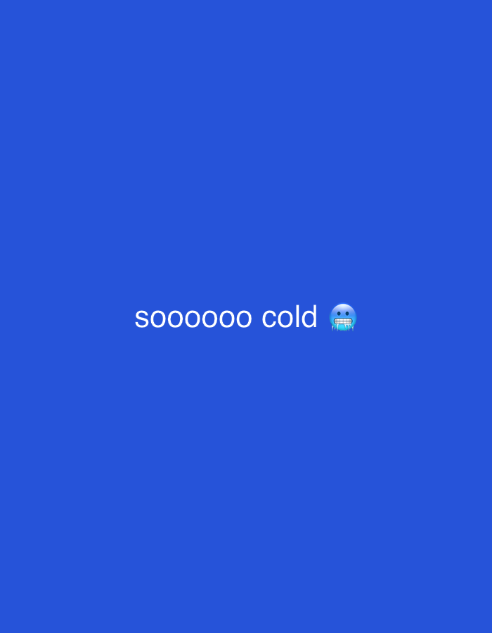 The image displays a uniform royal blue background. Centered horizontally, slightly above the vertical midpoint, is white text that reads "sooooooo cold". To the immediate right of the text, a blue-faced emoji with chattering teeth and icicles hanging from its chin is present. There are no discernible people, subjects, objects other than the text and emoji, actions, or interactions depicted. The environment is abstract, consisting solely of the blue color field. No specific location within the city of Bursa, Turkey, or any geographical area, can be identified from the visual content.