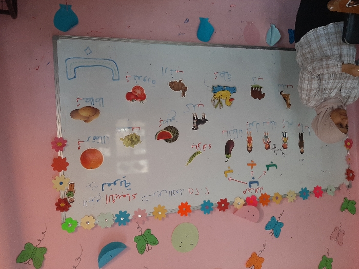 - "A light-skinned woman, wearing a light beige hijab and a white and light blue plaid long-sleeved shirt with dark trousers, stands on the left side of a classroom in As-Salihiya Municipality, Syria" by FM-NpFIv2, licensed under CC BY 4.0