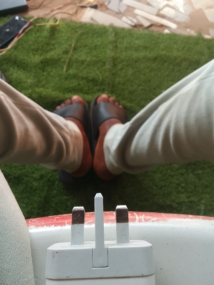The image presents a first-person, downward perspective from the city of Onitsha, Nigeria. In the immediate foreground, a white, three-pin (Type G) electrical plug or power adapter is visible, resting on a worn surface with a red and white painted edge. Directly behind this object, a person's lower legs, encased in light-colored trousers, extend towards the center. The individual wears dark-colored slide sandals, exposing their feet, which are positioned on a green artificial turf surface. In the blurred background, beyond the artificial turf, a disorganized outdoor area is discernible, featuring scattered light-colored debris, several tangled wires, and a dark, rectangular electronic device situated on the turf to the left. No explicit actions are depicted.