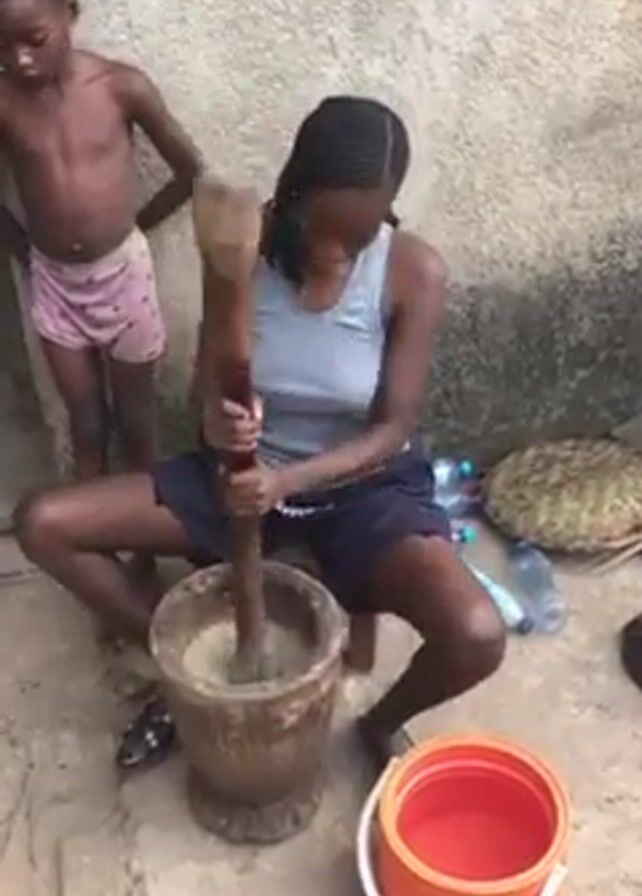 A young woman is grinding grain in a wooden mortar with a wooden pestle, sitting on a stool in front of the mortar. She is wearing a gray tank top, dark blue shorts, and sandals. A young boy in pink shorts is standing next to her, watching. There is a red bucket with water next to the mortar, along with several water bottles and a woven basket. The scene takes place outside against a wall.